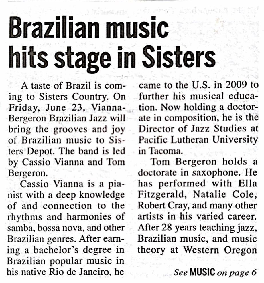 Vianna Bergeron Brazilian Jazz is led by pianist Cassio Vianna and saxophonist Tom Bergeron and features vocalist Rosi Bergeron, bassist Wagner Trindade, and drummer Todd Strait. The group focuses on music by Brazilian artists and original compositions by members of the band. All are steeped in traditional and contemporary Brazilian rhythms and practices. Cassio, Tom, Rosi, and Wagner have been playing Brazilian music together since 2009.